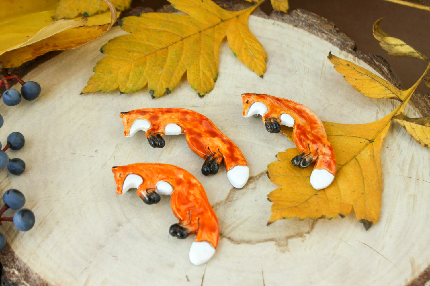 Made from lightweight clay and painted in bright watercolor shades of orange, white, and black. Finished with a clear resin layer for protection and fitted with a stainless-steel pin back. The design features a curled, sleeping fox with a glossy surface and fine painted details.