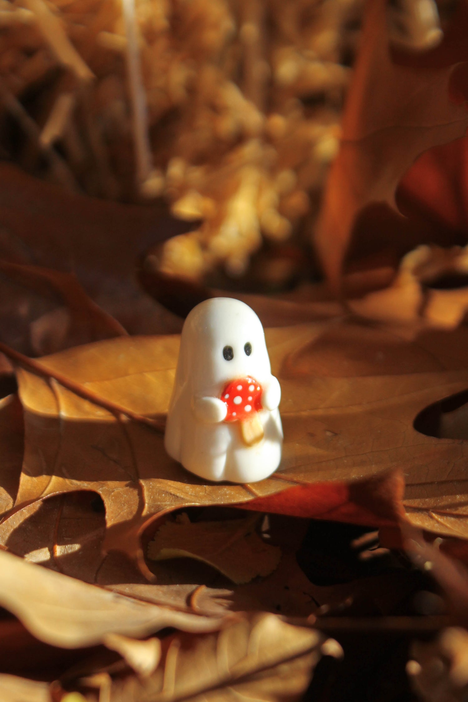 Hand-sculpted little spirits that prefer cozy haunts over spooky ones. Each ghost has found something special to hold or wear this autumn: