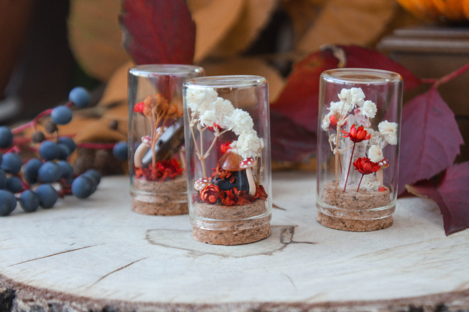 A vibrant series of forest scenes preserved under glass, inspired by the deep reds and russet tones of late autumn. Each terrarium is handmade with natural elements and tiny sculpted details, blending the warmth of gemstones, mushrooms, and flowers into one-of-a-kind miniature worlds.